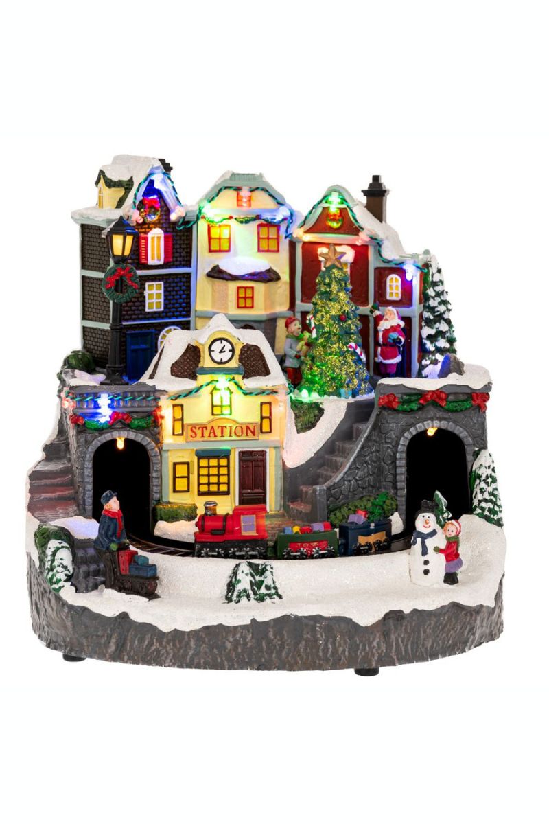 Χριστουγεννιάτικο εντυπωσιακό χωριό με πολλά φωτιζόμενα σπίτια και τρένο που γυρνάει γύρω γύρω, μέσα σε τούνελ. Εχει φως σε αρκετά σημεία και μουσική με 8 τραγούδια. Η μουσική έχει κουμπί On/Off. Λειτουργεί με ρεύμα με μετασχηματιστή 4.5V που περιέχεται. Υλικό κατασκευής πολυρεζίνη και πλαστικό. Πολύ καλή απεικόνιση και ποιότητα κατασκευής. Τo προιόν μπορεί να έχει μικρές χρωματικές διαφορές απο την φωτογραφία.
